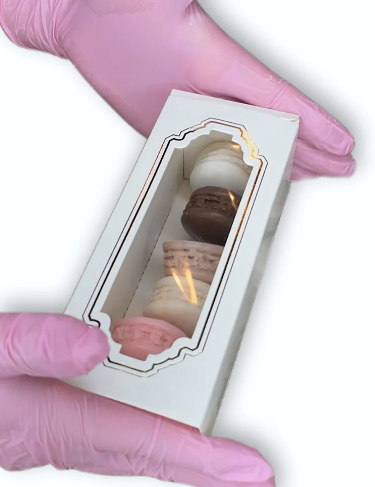 Each order includes 1 box of 5 macaron soaps with 4 varieties of dessert scents.